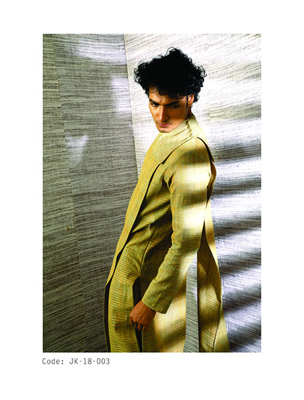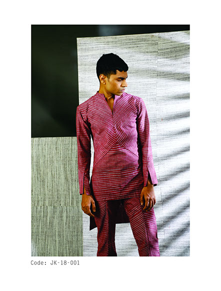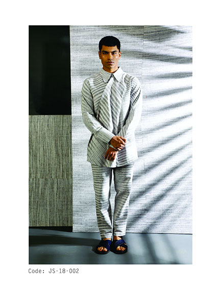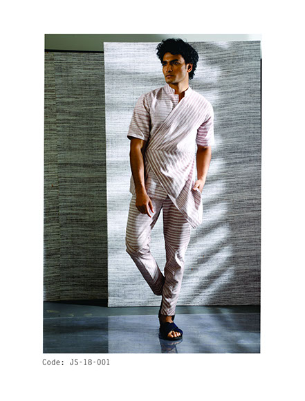 The line has three directions rolled into cohesion with Tunics, Pants, Shirts, Jackets and coats. Working with indigenous fabrics in different textures, count and weights, the uncertainty of the way the patterns form in traditional handloom material render the clothes one-of-a-kind as no repeat will ever be the same, except in its form. Blur stripe formations are used to converge, slope and align, divulging patterns, volume, swirls and some structure as well.